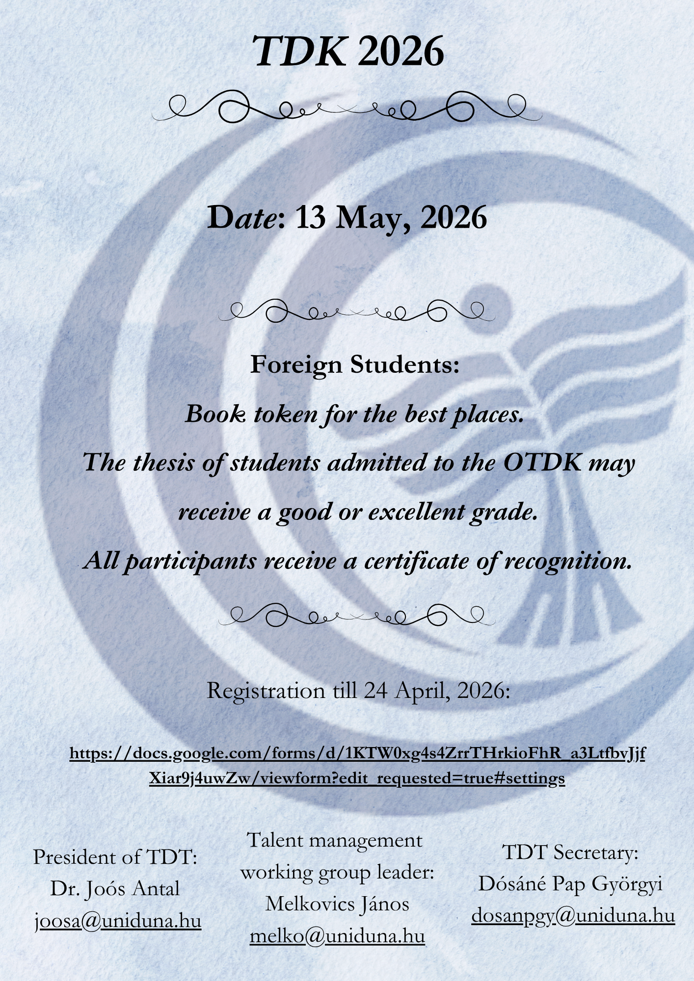 For any further questions, they can contact Györgyi Dósáné Pap -TDT Secretary at This email address is being protected from spambots. You need JavaScript enabled to view it.